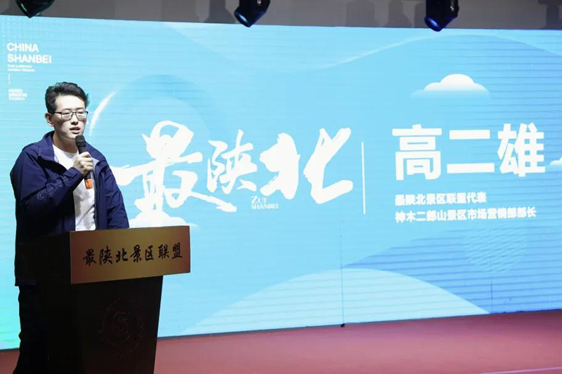陕北景区联盟代表—神木文旅集团红碱淖景区市场营销部部长李平先生与神木二郎山景区市场营销部部长高二雄先生分别上台致辞,共同表达了对此次推介会的期待与祝福。